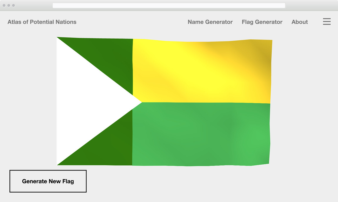 Atlas of Potential Nations, Computationally designed nations. In Atlas of Potential Nations we source and create a dataset containing the national symbols from every nation in the world: Name, Nations Heraldry, Passport designs, Flags, National Anthems, Maps, A history etc. All of these symbols fall within a specific set of semiotic rules. For example flags are built out of specific building blocks: bars in a certain direction, a specific set in colours, abstract shapes and sometimes a symbol. We use linguistic algorithms to analyse these building blocks in the existing national symbols on which we base new combinations of elements that form national symbols. More information here.